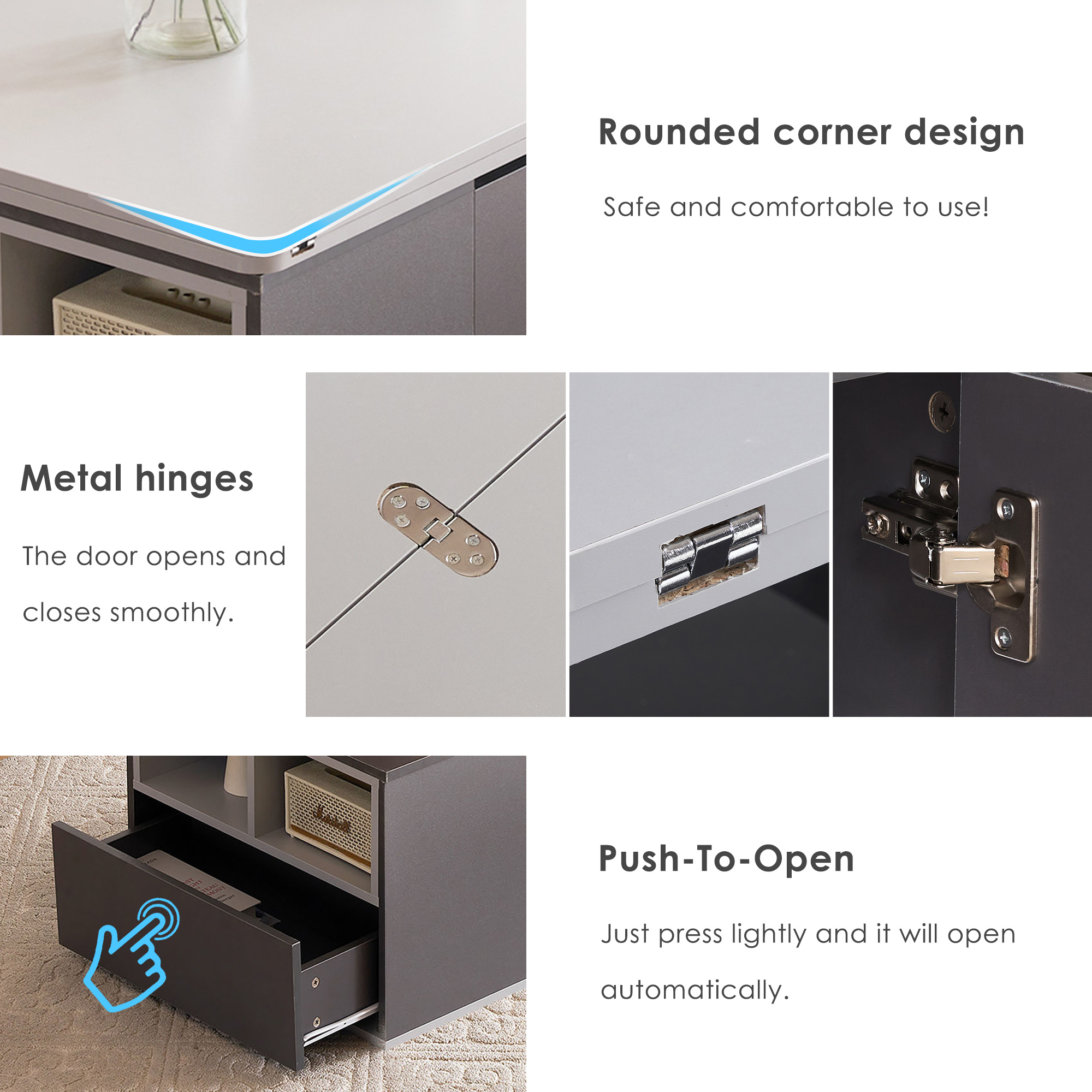 - Special Features: Creates a variety of furnishing options with large and small table tops. Rounded corner design and metal hinges, push to open drawers, make it safe and comfortable.